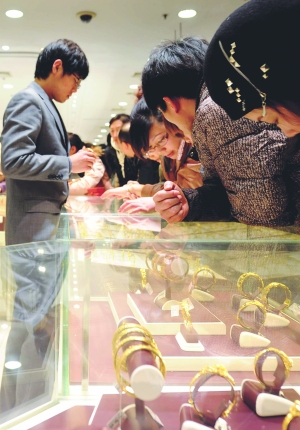 12月24日,顾客在北京菜百公司黄金首饰柜台前选购。