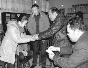 12月23日,花垣县团结中学黄张羽(左一)等5位困难教师每人从县教育局领导手中接过500元的慰问金。连日来,该县开展给困难教职工“送温暖”活动,全县180名困难教职工受到了关爱。