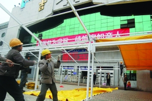1月5日,工人们在吉首火车站搭建临时候车棚。为迎接2012年春运,吉首火车站在车站外搭建1400余平方米的临时候车棚,为候车的人遮风挡雨。由于今年正式实行火车票实名制,该站还特别搭建了临时证件办理点,以方便旅客。 本报记者 田宏贵 摄