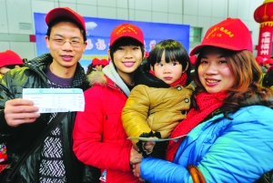 这是在福州打工20多年的湖南籍优秀农民工丁春红(右一)与两个女儿、弟弟(左一)在展示福州市总工会赠送的免费机票。