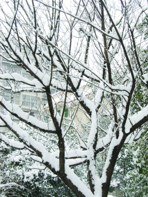 天空不紧不慢飘飞着雪花,远山都穿上了洁白的大氅,屋顶也戴上了厚厚的雪帽;许多树枝覆了一层积雪,原来的昂然棱角也变得圆润有致;一片片树叶上堆积的白雪,远远望去,像绽放着的洁白的油茶花。