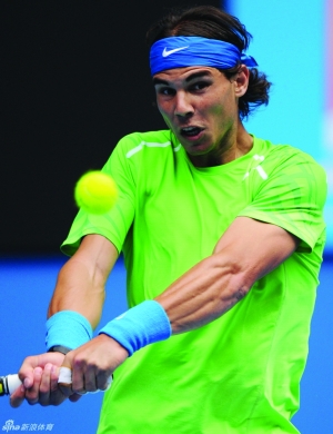 1月20日,纳达尔在比赛中奋力击球。当日,2012年澳大利亚网球公开赛男单第三轮的比赛继续展开争夺,西班牙选手纳达尔3比0胜拉科,率先晋级16强。