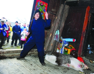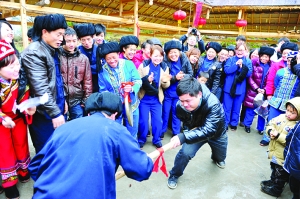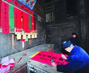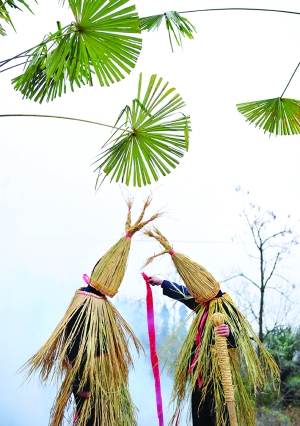 本报记者 张 谨 实习生 周 丹 春节,是中国各民族人民的传统节日。今年,文化部组织《中国节日志》春节习俗课题调查研究,土家族聚居的湘西保靖县陇木村沿袭着土家族传统的春节习俗,具有很强的典型性和代表性,被定为《中国节日志》土家族春节习俗调查研究基地,吉首大学土家族民俗研究基地也在该村挂牌。 1月17日,我们一行走进了陇木村,感受土家过赶年的习俗。 土家族过年,早早地就开始准备。时进农历冬至就杀年猪、祭土地神、做灌肠粑、腌腊肉、炕腊肉、炸糖馓、推豆腐、舂米、炸碗儿糕、打糍粑、磨米粉做粉粑;扫阳尘、贴春联、门神等。 进陇木村时,各家各户都已忙活开了。彭云德家,桌上满是新鲜出炉的糖馓,香味扑鼻而来,咬一口,齿颊留香。不远处,彭运强家中正在舂米,一人忙活着筛选,另一人则在一旁捣谷,合作亲密无间。而当走到彭金昆家时,大槌打粑粑的“咚咚”声、汉子们的吆喝声和姑娘大婶的嬉笑声,更是流露出了过年的喜悦与欢畅。 土家族是个善良、敬老、感恩的民族,过土家年自然少不了祭先祖、敬神仙的环节。杀年猪上供,众人虔心叩拜,以祈求祖、仙庇佑,来年风调雨顺。 1月18日,陇木村“土家年”庆祝活动正式拉开帷幕,村民们一早便欢聚操场,开展春节联欢。铿锵有劲的镏子,活灵活现的“狮”、“龙”舞,粗犷、诙谐的毛古斯和刚柔并济的摆手舞,形象地再现了土家人生活和农作的场景。经久不衰的娱乐项目“抵杠”、“扳手劲”、“背媳妇”也玩出了新花样,掌声、欢呼声一浪高过一浪。 “我和两个孙女是专门赶过来的,这个年过得真闹热。”从保靖县城赶来的彭图湘老人说道。 刚刚表演完打镏子的村民彭加贝说:“土家族是一个极具特色的民族,我以身为土家族人而自豪。现在民族的东西很少了,但在村里还能感受到那种土家氛围,特别是在过年的时候。” 到了开年饭之时,村民们三五成群,九十一桌,不论姓氏、不分门户,大家围炉而坐,大锅煮菜,大碗盛饭,大块吃肉,大声谈论着过去和对新年的展望,脸上满是笑容。 |