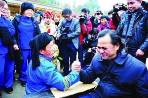 吉首大学文学院60岁的杨瑞教授(右)勇夺男子扳手劲第一名,当年的他当知青时曾经打败三个公社的扳手劲选手。