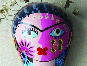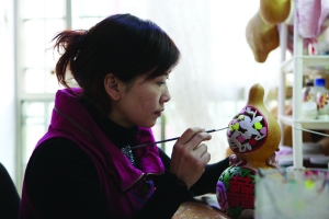 在雕刻葫芦的同时,她又琢磨“蛋绣”探索。“蛋绣”即在蛋壳上绣花。众所周知,家禽蛋壳轻薄易碎,在蛋壳上绣花,简直不可思议。这是一个以前没人做过的事,全靠自己探索。开始,因为不懂方法,她的双手常常被蛋液弄得黏滑潮湿。有时绣得差不多了,一不小心,蛋壳破损,前功尽弃。但凭着一股不服输的倔劲,经过反复试验、琢磨,她终于掌握了蛋绣的技巧,在洁白的蛋壳上绣出了漂亮的缎带花。除了缎带绣,还陆续创作了十字绣、彩线绣、珠绣等。题材也由最初的花卉扩展到人物脸谱、吉祥文字、风景、静物等等。作品有可放在桌上的精美摆件,也有可挂墙壁的装饰品,让人见之无不喜爱。