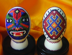艺术是美丽的,艺术的创作过程却是枯燥甚至艰苦的。千万别小看蛋绣,首先要将蛋液取出,把里面清洗干净,画上图案,再在蛋壳上用细小的针头钻眼,然后在所钻的眼中穿针引线,在蛋壳上绣出各种图案来。一幅普通的图案,常常要钻几百个小眼。而一幅复杂的图案,要钻一千多个眼。每每放下钻子,她的手指累得几乎不能张开。