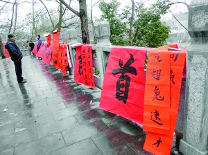 1月20日,一名吉首市民站在吉首市峒河公园里晾晒春联。节前,不少书法爱好者在吉首城区人口密集路段免费赠送春联,求得春联的市民纷纷就近晾晒春联,待晾干墨迹后方拿回家。大伙聚在一起晾晒春联,形成了一道独特的春节文化风景。