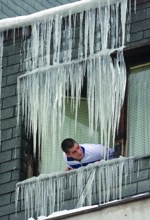 2月2日,在塞尔维亚西南部城市乌日策,一名男子从布满冰柱的窗口向外张望。 近日有寒流袭击大半个欧洲,乌克兰、波兰、罗马尼亚、塞尔维亚等中东欧国家最低温度跌破零下30摄氏度。据报道,过去一周欧洲地区的严寒天气已造成160多人死亡。 新华社发