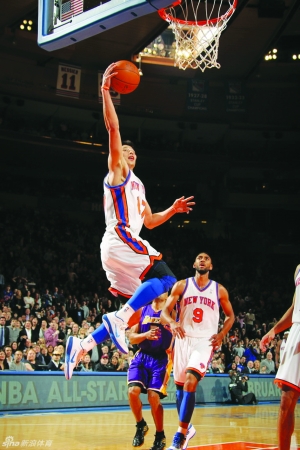 2月11日,尼克斯队员林书豪在比赛中滑翔上篮。当日,NBA常规赛继续进行,尼克斯主场92比85力克湖人,取得四连胜。当场比赛,林书豪砍下38分7次助攻,而在此前的三场胜利中,他亦有不俗表现,在NBA这个残酷的“战场”中一鸣惊人。据了解,23岁的林书豪出生在美国加州,其祖籍为浙江嘉兴,父母来自台湾彰化。前年虽在选秀大会上落选,可他因在哈佛大学队中表现抢眼而被勇士队挑走,他因此成为NBA史上首位亚裔美国籍球员,也是哈佛大学自1953年以来首位进军NBA的球员。