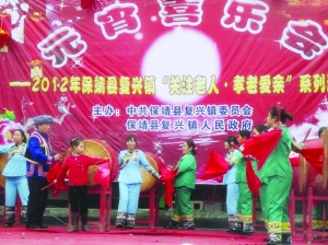 2月6日,元宵节。保靖县复兴镇党委、政府同该县民政局组织镇内文艺队、迎宾队、龙狮队、秧歌队、腰鼓队、苗鼓队来到镇敬老院为23名老人举行“关注老人、孝老爱亲”系列元宵喜乐会。给老人们拜年,送上慰问品和慰问金,同老人们联欢、与老人们包元宵比赛、为老人们准备节日晚宴。在多样的节目中,为老人们送上了一道道丰盛的元宵民俗“大餐”,乐了、饱了、醉了23名孤寡老人。 彭书凤 张发科 李 璐 摄