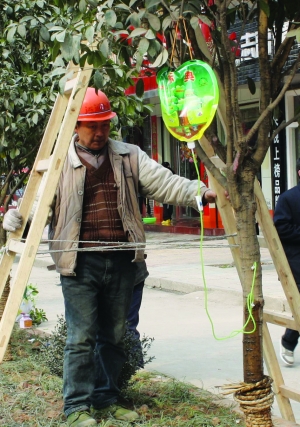 2月8日,工人正在给新移栽的树木“打点滴”,这是发生在龙山县城的一件新鲜事。1月下旬,龙山县在入城公园及城区移栽景观大树700余棵,为了保证这些新移栽树木的成活率,该县林业局便给每颗树木配备了一袋吊袋液,通过吊针向树木补充营养,使之增强适应新环境的能力。