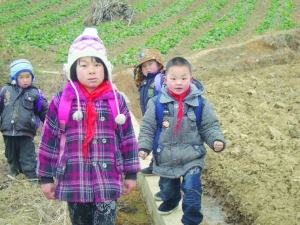 新学期,永顺县松柏小学的学生高高兴兴上学去。图为松柏镇大桥村的小朋友,一路相互帮助,愉快地走向学校。