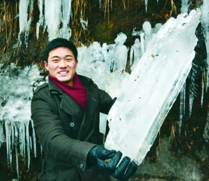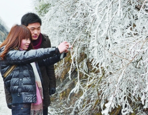 2月16日,两名过路的年轻人在岩口公路上拍摄雾凇景观。