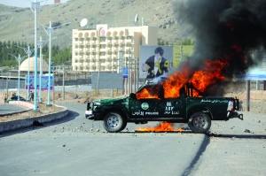 2月24日,在阿富汗西部城市赫拉特,一辆警车在抗议活动中被烧毁。
