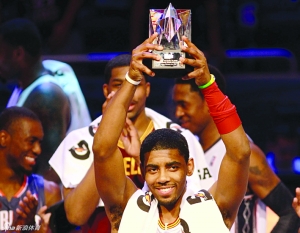 2月25日,NBA全明星新秀赛结束后,欧文高举MVP奖杯。当日的全明星新秀赛上,今年状元欧文拿下34分9助攻,带队取胜同时荣膺MVP。