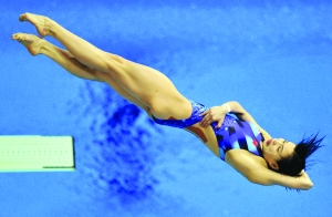2月25日,中国跳水队队员吴敏霞在比赛中优美旋转。当日,2012年跳水世界杯赛在英国的伦敦展开第五日角逐。在女子三米板决赛中,吴敏霞以368.95分夺得冠军。另一名中国跳水队队员何姿以365.40分名列第二。 (据新华网)