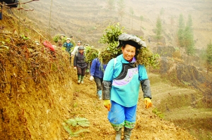 2月23日,保靖县夯沙乡夯吉村茶农背着免费的茶苗上山定植场景。