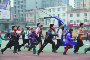 3月1日,龙山县第五小学师生正在开展春季长跑运动。当日,该校启动“2012春季阳光体育长跑活动”,规定全校师生在校时每天绕着学校塑胶操场跑上1000米。据学校负责人介绍,该校通过开展各种体育运动,适当增加体育课的运动量,并将集体跳绳、体育游戏、学校自编趣味运动加入课间操,切实保证学生每天参与锻炼一小时。