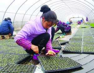 “现在,屋门口的工都忙不赢,工资也不比在外打工少。”3月13日,泸溪县达岚镇达岚坪社区4组妇女康爱兰(前一)正在育苗大棚里帮烟技员打工。她一边匀插软盘中的烟苗,一边告诉笔者。