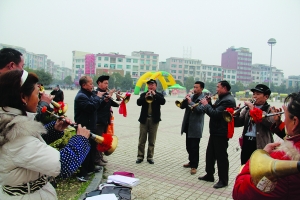 龙山县是文化资源大县,也是全国文化先进县,该县境内具有200多项土家特色的非物质文化遗产。土家唢呐作为一种民间婚庆、祭祀乐器,一度被遗忘。近年来,随着该县对非物质文化遗产的传承和保护不断重视,土家唢呐再次焕发出生机。图为3月15日,一群爱好者,自发的来到县城世纪广场切磋技艺。 胡 域 摄
