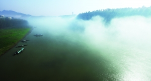 3月24日,连续多日的低温阴雨天气终于结束,泸溪县迎来久违的阳光,雨后初晴,沅江泸溪段出现难得一见的“雾锁沅江”美景。上午8点多,沅江笼罩在一片浓雾中,若隐若现,迷离如幻,宛若一条飘拂的玉带,当太阳从江边山峰后面探出头来,把第一缕阳光投向江面,浓雾在江风的吹动下,从江面蒸腾而上,飘飘忽忽地顺着山谷爬上山顶,在山水间游荡,将山顶及山顶的桔颂塔轻轻围绕,有一种如入仙境般的感觉。“雾锁沅江”美景也吸引了摄影爱好者前来拍摄。