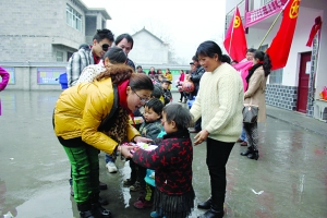 3月20日下午,花垣县2012年团干部培训班学员们深入到该县吉卫镇各腾村看望慰问留守儿童,并为他们送去慰问品和现金共计2800元。图为学员们为留守儿童赠送儿童书籍。
