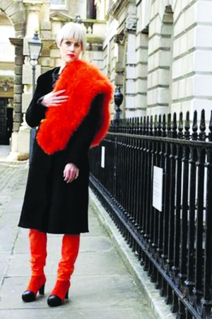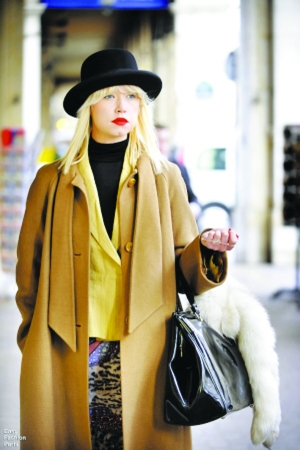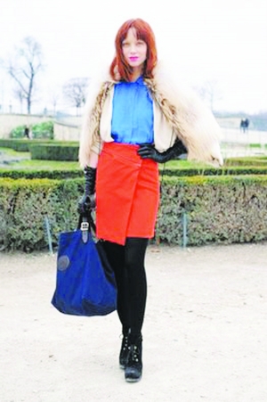 另一种橘色亮点方案,一个橘色披肩+橘色鞋,皮草披肩有点贵妇的味道。