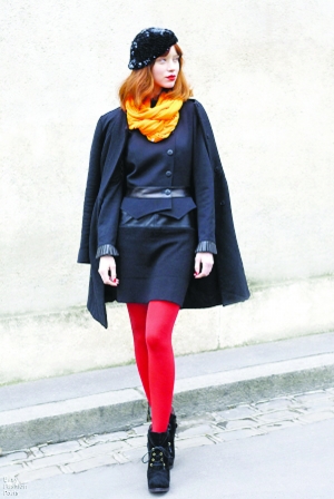 . 色彩的经典案例,如果你的衣服颜色偏暗,又想穿出亮丽的感觉,可以参照这一套,橘色围巾和橘色丝袜,是不是感觉整个人都不同了呢?其实黑色外套可以换成披风,更加文艺气。