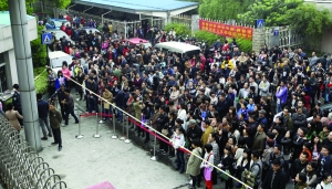 4月14日,杭州锦绣·育才中学附小校门外挤满了前来为孩子报名的家长。