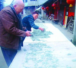 4月19日上午,永顺县毛坝乡毛坝村茶农在晾晒烘焙过的野生莓茶。