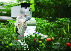 当日,第13届中国(寿光)国际蔬菜科技博览会在山东寿光开幕。本届“菜博会”上推出了具有采摘、喷药功能的蔬菜机器人。这种机器人能够识别蔬菜的颜色和形状,等到作物成熟以后自行采摘。 新华社 苏青 摄