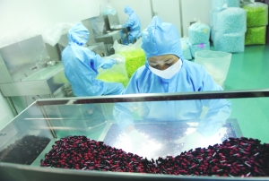 4月28日,浙江宏辉胶丸有限公司包车间的几名工人在工作。