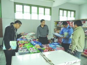 4月24日至26日,泸溪县联合检查组对全县学校食堂、商店及周边饮食摊点进行了专项检查。检查的主要内容包括食品卫生许可证持证情况、食品原料进货索证与登记情况、食品加工过程卫生状况、餐具消毒保洁情况等。针对检查中存在的问题,检查组现场下达整改意见书。图为检查组正在洗溪学校的商店检查。