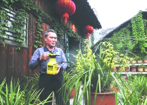 4月30日,吉首市乾州古城内蔬菜社区的养兰世家传人陈金章在为百年蕙兰浇水。随着该市立足当地养兰的悠久历史和生态资源,将兰花定为市花并大力发展兰花产业,陈金章增添了养兰的信心,要为打造市花品牌尽一把力。