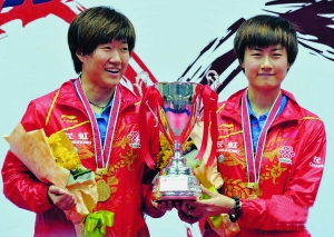 5月10日,国际乒联于官方网站发布消息称,中国乒乓球队确认以年仅21岁的丁宁取代郭焱,出席伦敦奥运会乒乓球女子单打和团体比赛。国际乒联给出的奥运会参赛名单显示,国乒队上报丁宁的时间为本月4日,9日予以确认。据国际乒联称,国乒队给出的理由是郭焱受伤。图为2012年3月1日,在澳门进行的第20届亚洲乒乓球锦标赛中获得女双冠军的中国选手丁宁/郭焱(左)在领奖台上留影。 新华社记者 卢炳辉 摄