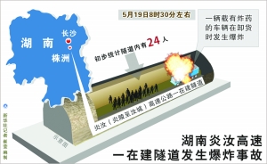 新华社长沙5月19日电(记者 陈黎明 陈文广)新华社记者多方核实了解到,19日上午湖南一在建高速公路隧道发生爆炸,造成20人死亡。 据了解,事故发生时,隧道现场有24人,目前已有4人生还,其中有1人为重伤。 事故发生后,湖南省交通部门和当地政府部门紧急调集专业煤矿搜救队伍进行救援,消防、公安等部门也立即赶到现场参与救援。为防止救援时隧道塌方,湖南省交通运输厅紧急组织桥梁安全方面的专家组赶赴现场协助救援。 这起事故发生在19日8时30分左右。一辆载有炸药的车辆进入炎汝(炎陵至汝城)高速公路一在建隧道施工层面,在卸货时发生爆炸。事故原因还在调查。 |