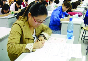 5月22至23日,2012吉首市中小学教师专业素养大赛在该市八小举行。比赛内容包括师德演讲、书法比赛、教案设计、课件制作、说课比赛。图为参赛选手制定导学案。 龚汉周 王建春 摄