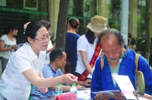6月11日,龙山信用联社会计部员工(左一)向老百姓讲解反洗钱知识。