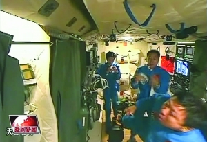 6月23日,航天员景海鹏、刘旺、刘洋在吃由科研人员特意准备的粽子的替代品———八宝饭(电视画面截屏)。 新华社发