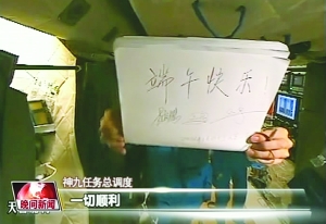 6月23日,景海鹏把写有“端午快乐”四个大字并签有航天员景海鹏、刘旺、刘洋名字的飞行手册向地面工作人员展示(电视画面截屏)。 当日是端午节,正在太空执行首次载人交会对接任务的航天员景海鹏、刘旺、刘洋向全国人民、全球华人送上节日祝福。 新华社发