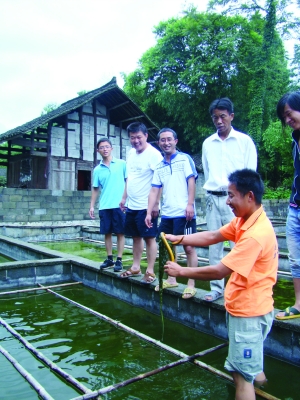 6月27日,永顺县毛坝乡五寨村31岁的村民黄如山(右一)正在向前来参观、学习的客人展示他养殖的黄鳝。