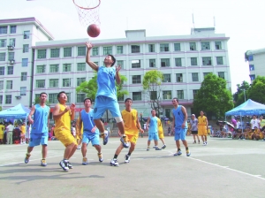 7月7日,保靖县实验小学和雅丽中学篮球代表队正在进行激烈的比赛。当日,该县“园丁杯”教职工篮球赛开幕。本次篮球赛为期5天,共有35支代表队400多名教职工参加。