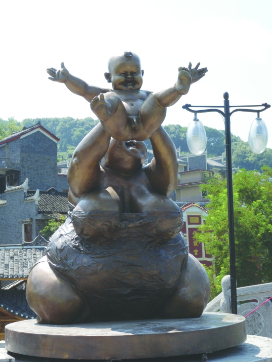 “肥”桥上一位双手高举胖娃的巨胖肥女铜雕。