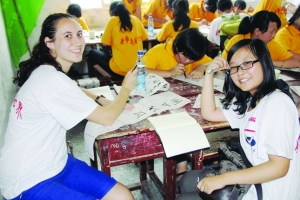 本报讯(通讯员 彭元伟)一种文字能够引起外国学生的学习热潮,文化显示出深层的魅力。 7月12日下午,参加保靖第六届中美“好学生闯世界”英语夏令营的中美学生,在保靖民族中学校园内切磋中国书法。当日,保靖本土书法家滕树耀先生进行了现场的示范和指导,并鼓励大家要勤学苦练,将书法这门艺术传承下去。 示范后,一场书法大比拼在各班教室正式上演。在课桌前,只见中方同学熟练地摊开宣纸,拿出早已准备好的毛笔,挥毫泼墨。如行云流水的行书、整齐一律的楷书、张扬飞舞的草书……有的同学还在大作上画上自己的印章,一副大家的风范。 来自太平洋彼岸的营员们看了老师的表演后,更是赞叹不已,纷纷拿起毛笔在纸张上一试身手。Lauren在志愿者的指导下成功地写出了自己的汉语名字:余玛丽。她表示,这是她第一次接触中国书法艺术,觉得很有意思,回国后,将把在此次的经历分享给家人、朋友、同学。 |