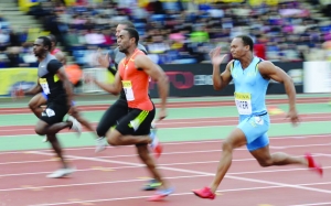 7月14日,美国名将盖伊(右二)在比赛中冲刺。当日,2012年田联钻石联赛伦敦站展开激战,在备受关注的男子100米飞人大战里,盖伊以10秒03夺冠。这也是他钻石联赛两连冠,其钻石积分追平牙买加的博尔特和鲍威尔,三人并列第一。