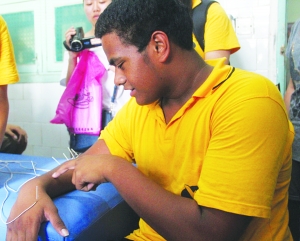 本报讯(通讯员 彭元伟 彭恩武) 7月21日,保靖中医院的针灸科迎来了为了体验正宗中医针灸疗法的39名美国师生。 在诊室,一位中医师正在用银色的细针为一位患者治疗腿疾。只见医师用酒精消毒后,有规律地在患者膝盖周围的穴位上刺下。 “哇,中医很奇妙,小小的一根银针,居然能治好那么多疑难杂症。细针真的太厉害了!”看到了针灸疗法,听完医师的讲解后,美国领队Chong Malia兴奋地发出了惊叹。他当即表示希望一试。准备妥当后,中医师熟练地在Chong Malia头部穴位插入六根银针。Chong Malia没有丝毫痛苦,并且露出了很享受的表情,让旁观的美国朋友心里痒痒的,纷纷跃跃欲试。 “这是头一次扎针,头部有些微微的胀,扎完后感觉很舒服很精神。”五分钟后,Chong Malia扎针结束,通过翻译对笔者说。接着陆续有好几位师生进行了体验,并都连连称赞针灸的神奇。 |