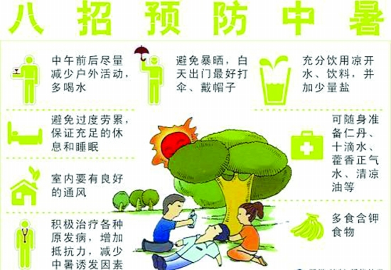 中暑急救四字诀:搬擦服掐