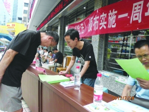7月28日,一名市民在向吉首市人社局工作人员咨询养老保险政策。当日,州、市人社局30余名工作人员走上吉首街头开展《社会保险法》颁布实施一周年宣传活动,向广大市民群众宣传养老保险、失业保险、工伤保险、医疗保险、生育保险相关政策知识。1000余名市民群众进行了现场咨询。 记者 顾勇兵 摄