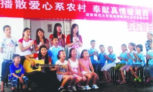 7月19日,湖南师范大学党委宣传部新闻网暑期社会实践服务团的师生们,在永顺县万坪镇中心完全小学,和该校的学生们一道联欢,演出结束时,并将募集的20000多元钱捐给了万坪镇中心完全小学。至此,该校社会实践服务团的师生们结束了为期10天的义务支教活动。此次的播撒爱心,奉献真情活动,深受万坪镇广大人民群众的赞荣。