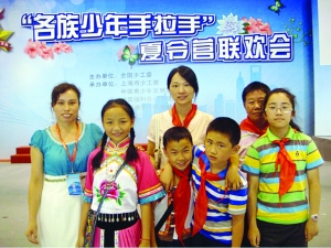 活动中,来自全国各地的少数民族少年和上海本地少年结成180个对子,手拉手参观了辰山植物园、上海科技馆、世博纪念馆,登上了东方明珠,开展了精彩的文艺活动,还受邀在结对的上海小伙伴家做客,体验城市生活,并与各族少年结下了深厚的情谊。 图为宋旎菁、卢洋与结对的上海学生在一起。